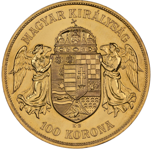 1908 Hungary 100 Korona - Franz Joseph I - Crowned Shield with Angels