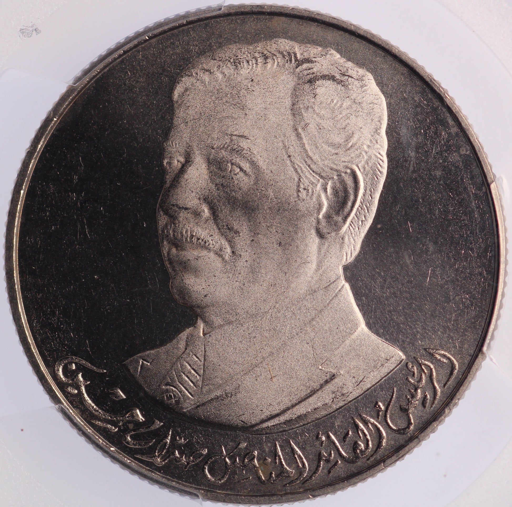 Obverse: Portrait of Saddam Hussein 3/4 left.