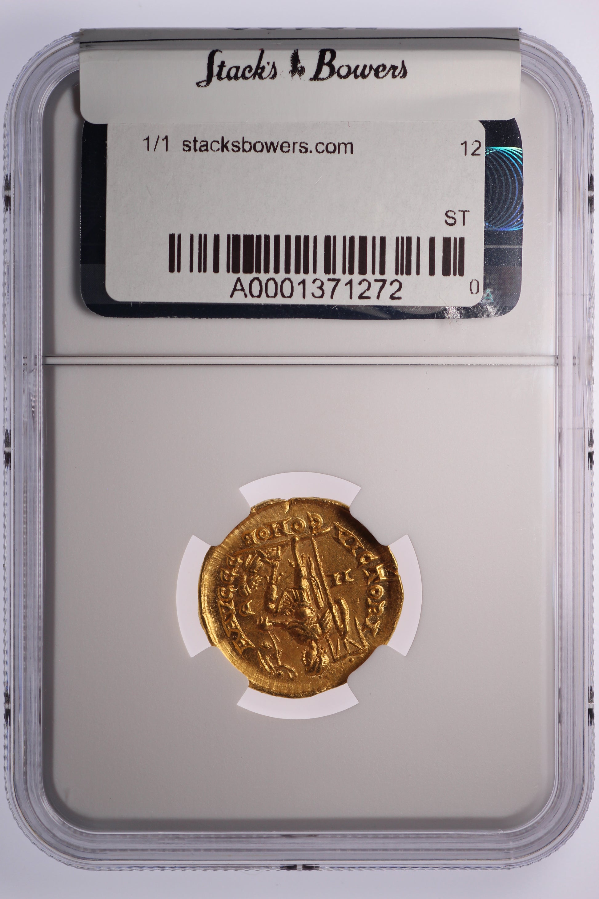 Reverse: Honorius standing faced to the right, his foot on a bound prisoner while holding a labarum, Victory on a globe to the right.