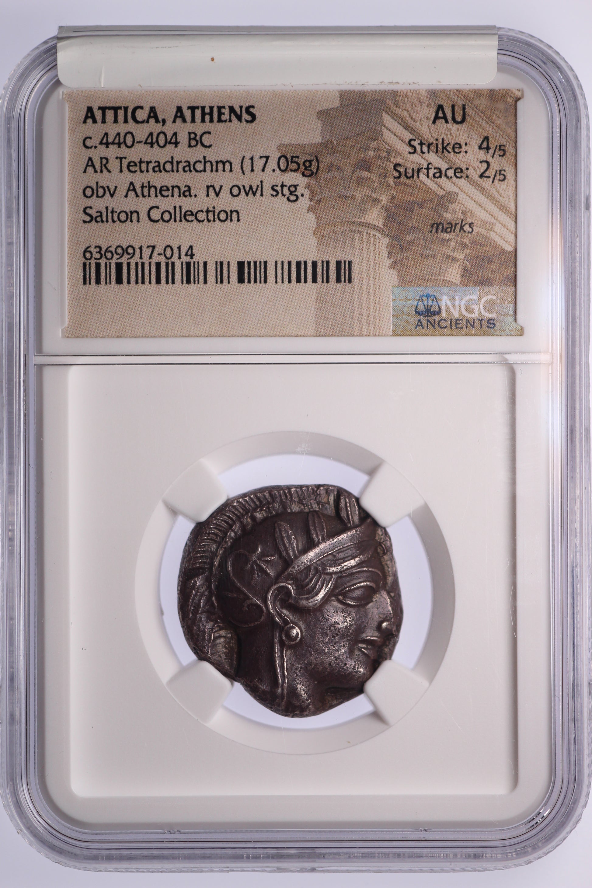 Obverse: Head of Athena facing right, wearing earring, necklace, and crested Attic helmet ornamented with three laurel leaves and vine scroll.